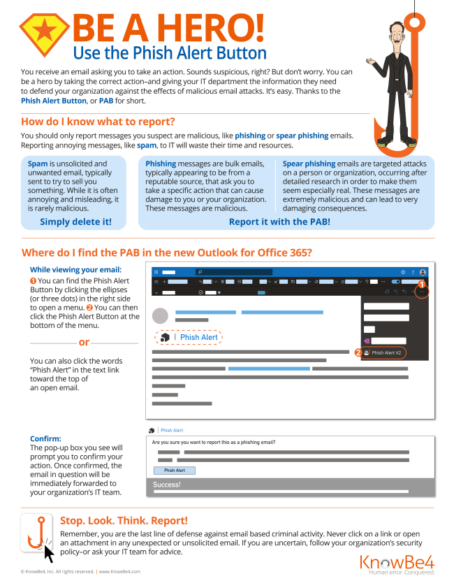 Phish Alert in your Outlook email, on both the web browser and desktop application. You can see below for more examples of phishing, which uses social engineering, and how to find the Phish Alert button in the new Outlook desktop app. If you ever fall for a phishing attempt, please reach out to the Technology Help Desk at extension 2031.