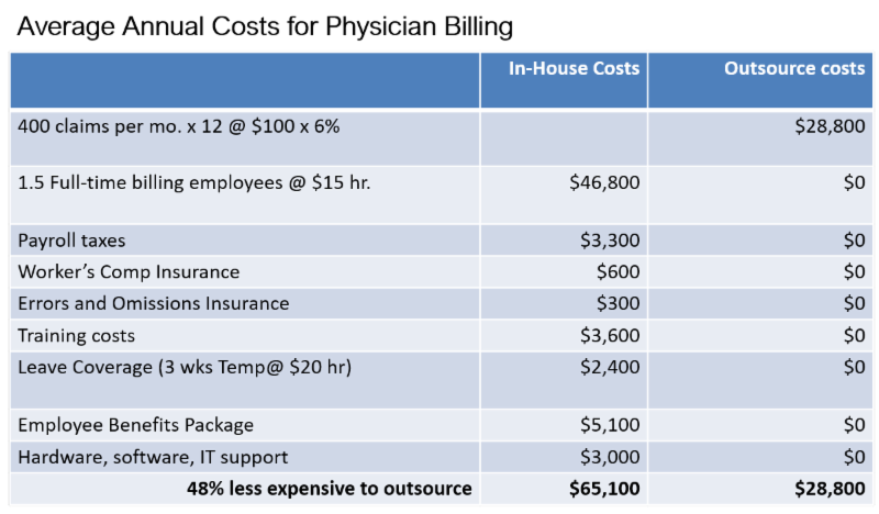 And the solution isn't staffing. Compare these costs for in-house v outsourced billing. Outsourced billing costs less than half of in-house billing and, for Fast Layne customers, yields an average 2% insurance rejection rate (versus 34% industry average) and gets you paid in as little as 7 days (versus average of 4-6+ weeks).