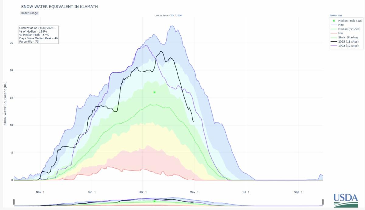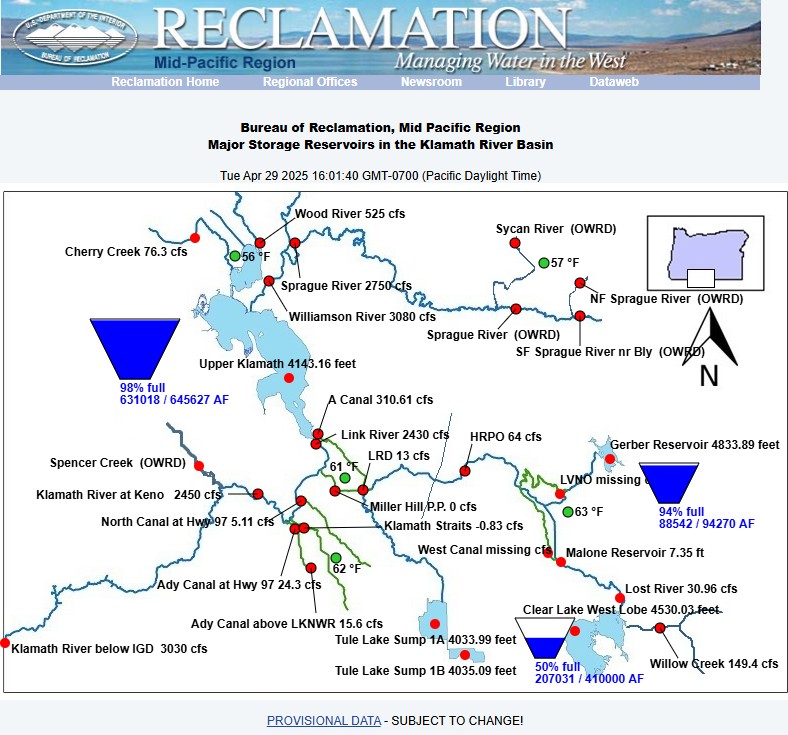 Current situation: Upper Klamath Lake storage continues to build slowly, causing angst for some with the high lake levels (which are currently below the engineered flood curve). Flows to the Klamath River below Keno continue to be released following the Biden era, December 2024, rules put in place by Reclamation.