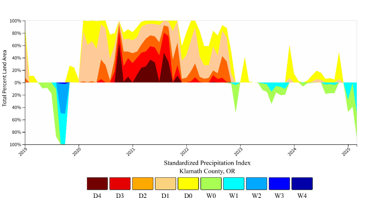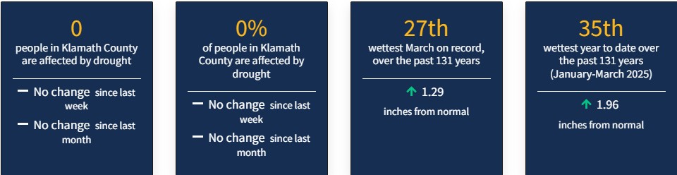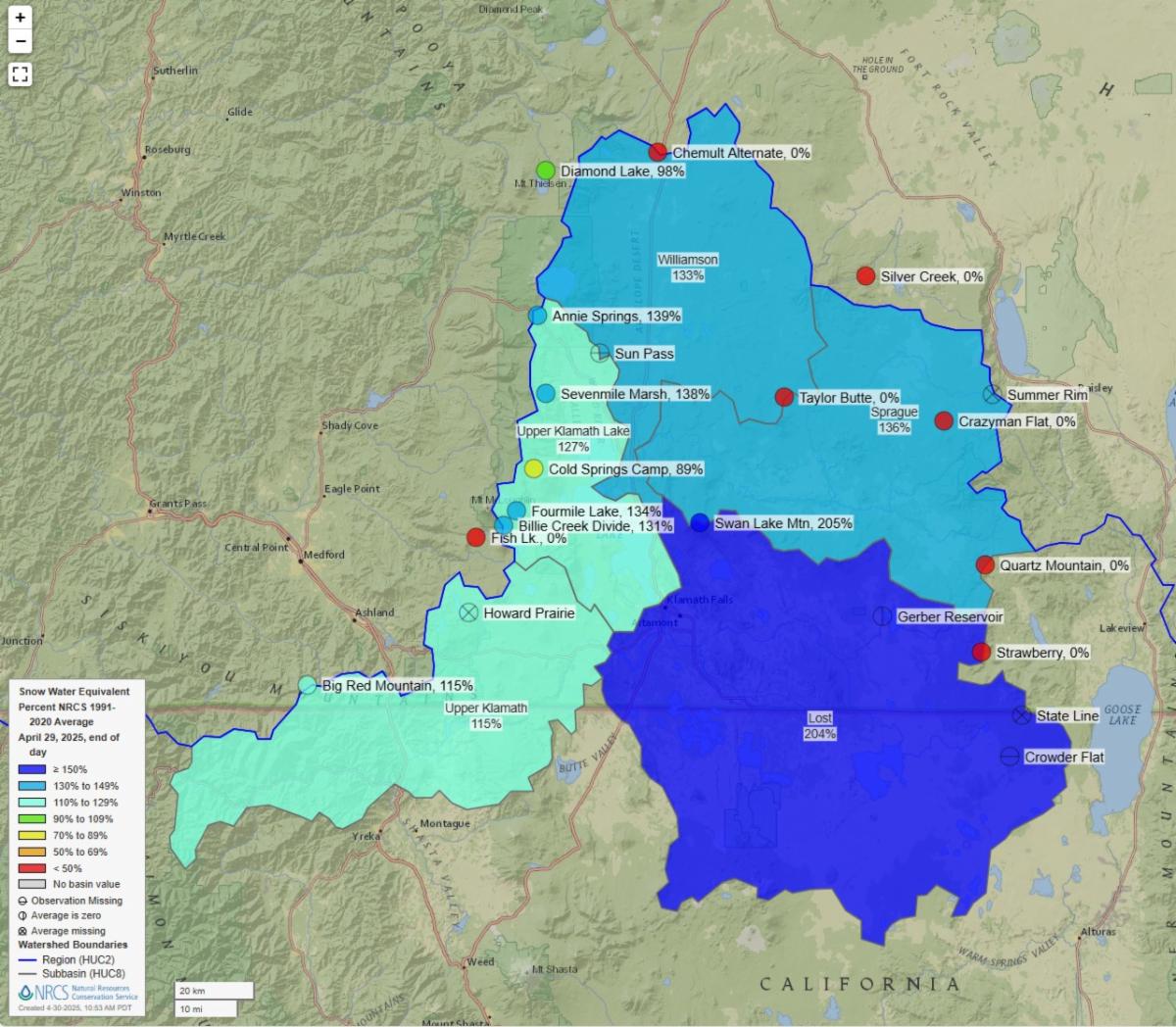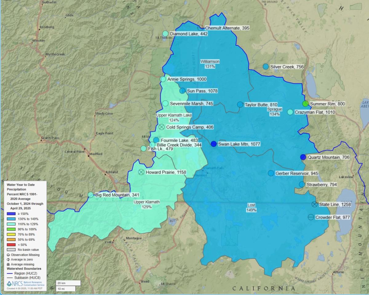 Modeling and precipitation forecasts provide anxiety for water managers in anticipation of another flood control release from Upper Klamath Lake beginning 1 May 2025...a flood control release, under Reclamation's new plan, reduces farmers' stored "deferred project supply" (DPS) from UKL storage. Flows are anticipated to increase above the model volumes by 1000cfs for an unknown duration.
