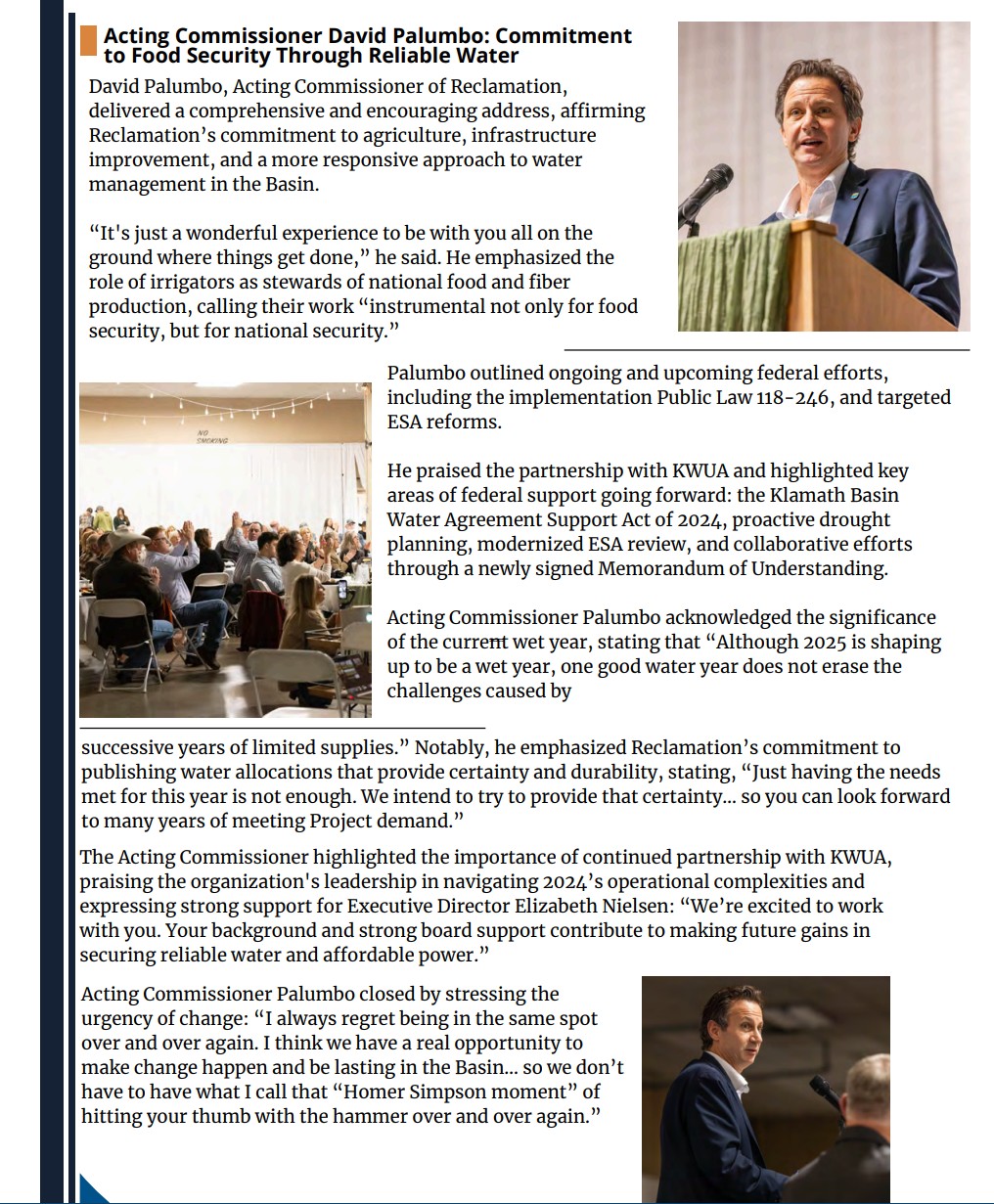 The Biden-era 2024-2029 Action Plan, still in effect, jeopardizes the Klamath Basin’s agricultural community by ignoring Reclamation’s legal and contractual duties and the environmental consequences of its decisions. This flawed approach threatens the livelihoods of our farmers, our local ecosystem, and the stability of America’s food supply. Despite a short-term reprieve from favorable weather, the plan fails to address systemic issues that put our region at risk.