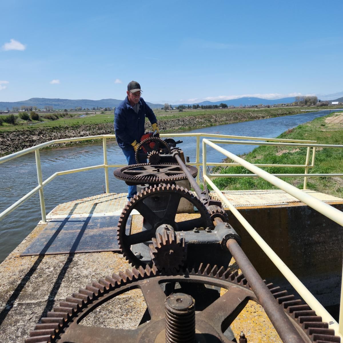 | | K.I.D. Operations & Maintenance Update | | Our assistant operations and safety officer, Willy Stevens, is operating a modified chainsaw to operate the gates on the 1921 G-Siphon Gates. Due to compounding problems in automation technology, too much water was released from the A Canal Headworks Easter morning. Willy is opening the gate to the Lost River Diversion Channel to return unwanted (potentially harmful) flow to the Lost River Diversion Channel, which made its way over the Keno Dam on a quick 260 mile trip to the ocean.