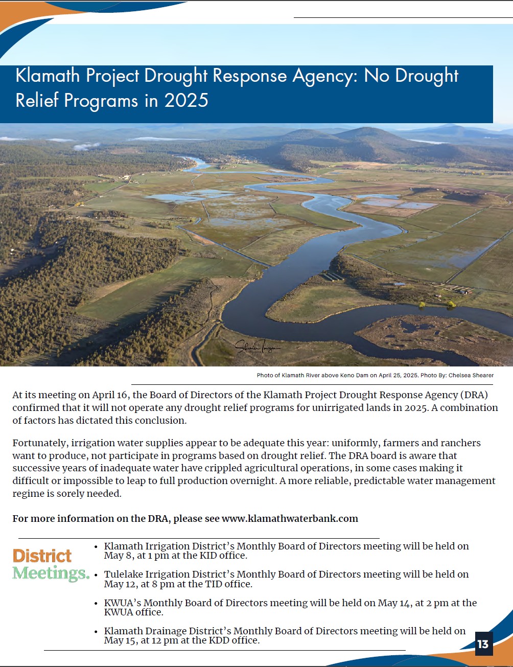 Klamath Drainage District’s Monthly Board of Directors meeting will be held on May 15, at 12 pm at the KDD office.