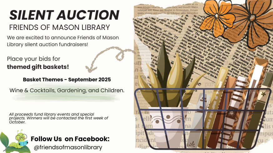 Visit the library between September 2 and 30 during regular business hours to view and bid on a variety of themed gift baskets, generously donated by Mason merchants. The baskets—on display in the library’s computer room—feature a wide array of items well beyond just books.
