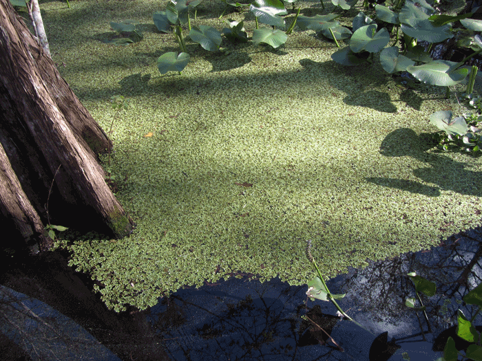 Duckweed is a layer of tiny, floating leaves on the surface of the water.