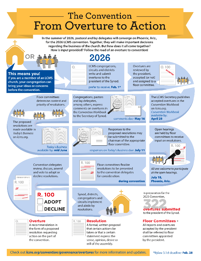 Congregations, districts, and others are invited to engage in the Synodical convention process through the submission of overtures (proposed resolutions requesting action from the LCMS convention). The deadline for overtures is February 28, 2026.