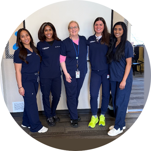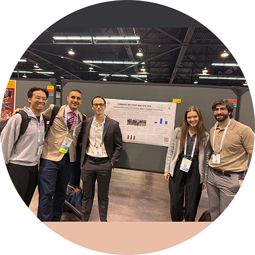 Victor Santamaria, Ph.D., M.Sc., PT, PCS, second from left, assistant professor of physical therapy and director of the Motion Analysis Lab; Steven Morella, D.P.T. '25, center, and Kari Pansler, D.P.T. '25, second from right, presented their research with Columbia University titled "Functional Gait Training with a Robotic Walker in Children with Bilateral Cerebral Palsy" at the American Physical Therapy Association Combined Sections Meeting, February 12-14, in Anaheim, California. Also in attendance were Anthony Tran, D.P.T. '25, left, and Steven Shifren, D.P.T. '25, right.