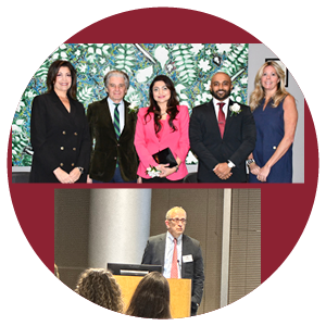 NYMC was among the celebrated honorees at the Westfair Communications Inc., annual Doctors of Distinction award ceremony. Hosted in the Skyline Dining Room on November 13, the evening was emceed by Michelle Novotny, Ed.D., top, right, senior associate dean for admissions and administration, with remarks by Alan Kadish, M.D., bottom, NYMC and TU president, and keynote address by Vilma E. Bordonaro, M.B.A., top, left, chief of staff. Among the honorees, bottom from left, were Augustine Moscatello, M.D., M.S., professor and chair of otolaryngology, who received the Doctor without Boundaries Award; Supriya S. Jain, M.D., FSCMR, FACC, FAAP, professor of pediatrics and radiology, and her husband who received the Power Couple Award; and Rahim Hirani, M.S., M.D.-Ph.D. candidate, who received the Promise for the Future Award.