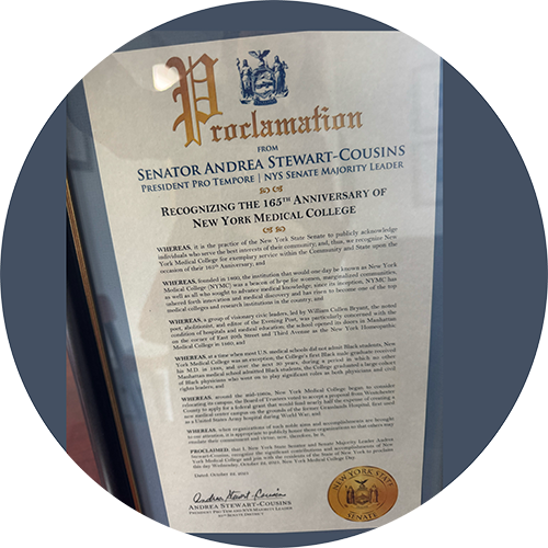 The 165th anniversary of NYMC and the Founder’s Dinner was occasion to proclaim October 22, as New York Medical College Day by New York State Senator and Senate Majority Leader Andrea Stewart-Cousins. The proclamation publicly acknowledges NYMC’s exemplary service, significant contributions, and accomplishments within the community and New York State.