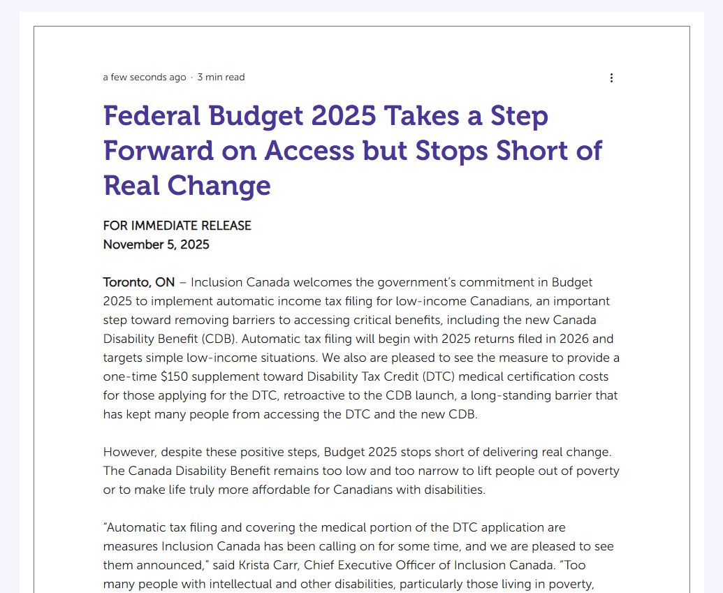 Federal Budget 2025 was released on November 4. Inclusion Canada welcomed the government's commitment to implement automatic income tax filing for low-income Canadians and one-time supplements towards Disability Tax Credit medical certification costs. However, the Budget falls short of delivering real change.
