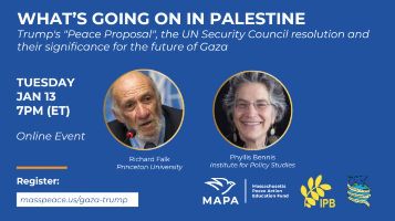 Massachusetts Peace Action is sponsoring an online event, featuring Richard Falk--former UN Special Rapporteur on the Occupied Territories for the UN Human Rights Council--and Phyllis Bennis, Program Director at the Institute for Policy Studies. They will discuss the developments on the ground in Gaza and the West Bank, the US role and Trump’s “peace” plan, and the consequences of the latest UN Security Council resolution.