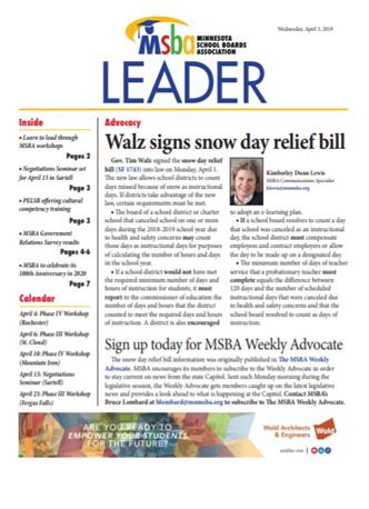 Gov. Tim Walz signed the snow day relief bill (SF 1743) into law on Monday, April 1. The new law allows school districts to count days missed because of snow as instructional days. If districts take advantage of the new law, certain requirements must be met.