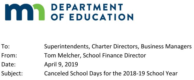 ■ The board of a school district or charter school that canceled school on one or more days during the 2018-2019 school year due to health and safety concerns may count those days as instructional days for purposes of calculating the number of hours and days in the school year.