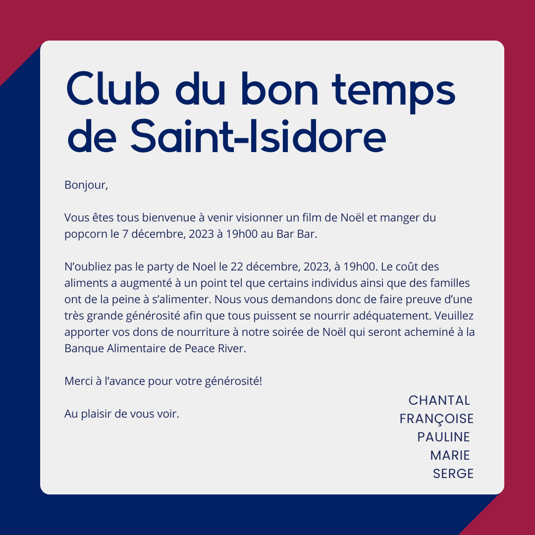 Chèque au nom du Club 50+ région d’Edmonton, à adresser à Johanne Denault, 4524, 38A avenue N.O., Edmonton, Alberta T6L 4B7