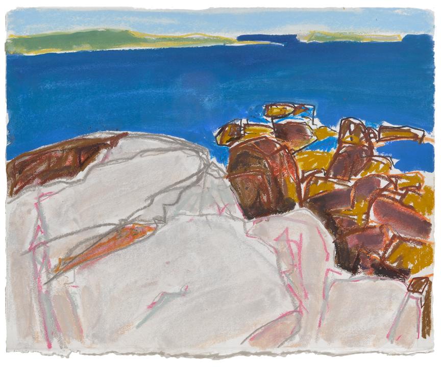 This commitment to immediacy shines through: broad, confident brushstrokes and lines reduce vistas, coastal landscapes, and intimate panoramas to their happiest, most essential forms — vibrant blocks of colour, dynamic shapes, and liberated gestures that evoke the joy of being fully present in nature's ever-changing scenes.