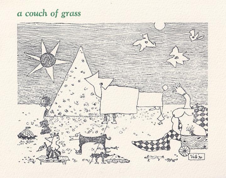 A self-taught artist, she famously said, “I paint what I dream, I draw what I know, and I collage who I am.” Her pen-and-ink drawings often carried erotic poetry, her collages layered personal identity, and her oils mixed whimsy with intimacy. A published poet, she grew verse into books including a couch of grass (below), The Amorous Unicorn and Selected Drawings & Verse. Vale continued evolving her practice into her 80s, producing abstract, textured works that probed the subconscious.