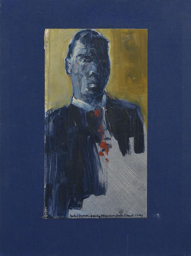 “Blue Munk” - James Ellison, Abysinian Baptist Church N.Y. City, 2003 - oil, bee’s wax, cookie tin on recycled book cover, 10.75 x 8 inches