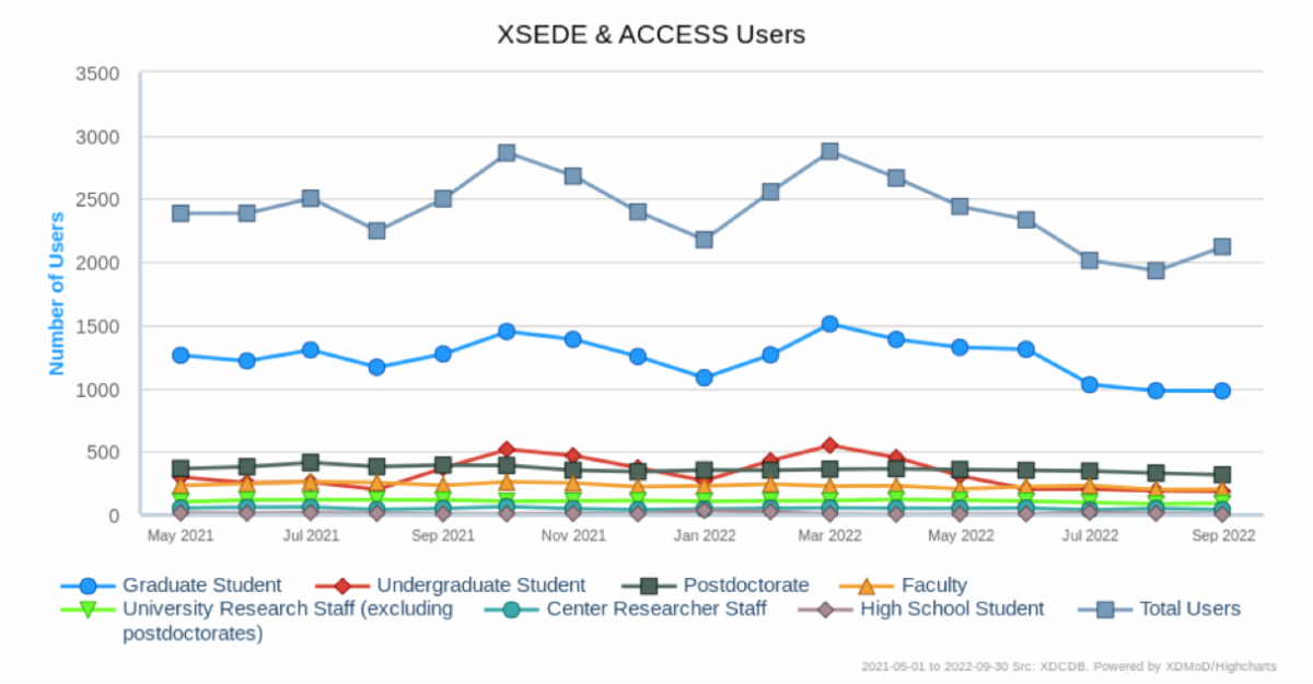 A critical goal of the transition was to minimize disruption to the CI research community so that researchers were able to seamlessly utilize the CI resources within the ACCESS environment. To demonstrate this, ACCESS MMS leveraged XDMoD to provide a comparison of system usage and job throughput between XSEDE and ACCESS. The analysis included metrics such as number of jobs run, number of service units consumed, breakdowns of usage by resource, by type of user and by field of science. For example, shown below is a plot of the total number of XSEDE and ACCESS HPC users broken down by NSF role. In all cases, there was no measurable difference between CI usage under ACCESS compared to usage under XSEDE. However, our comparsion did note a decrease in Gateway-unique user reporting during the transition, which was subsequently tracked to issues with the gateway API usage for two of the gateways (zhanglab and Cipres) as opposed to an actual decrease in Gateway jobs. This has been corrected, and we're working to recover historical usage where possible.