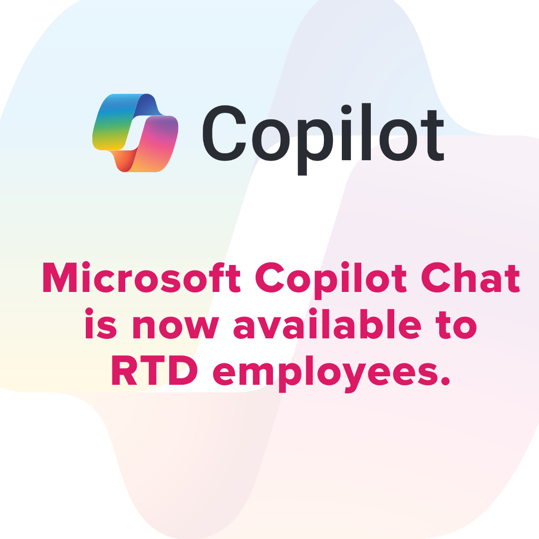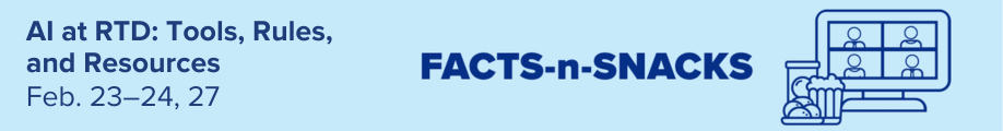 Discover how artificial intelligence (AI) tools like Copilot Chat can help you work smarter, not harder, at this month's Facts-n-Snacks, hosted by members of RTD’s Information Technology and General Counsel departments. Learn about the tools, rules, and resources you need to get started with using AI in the workplace.