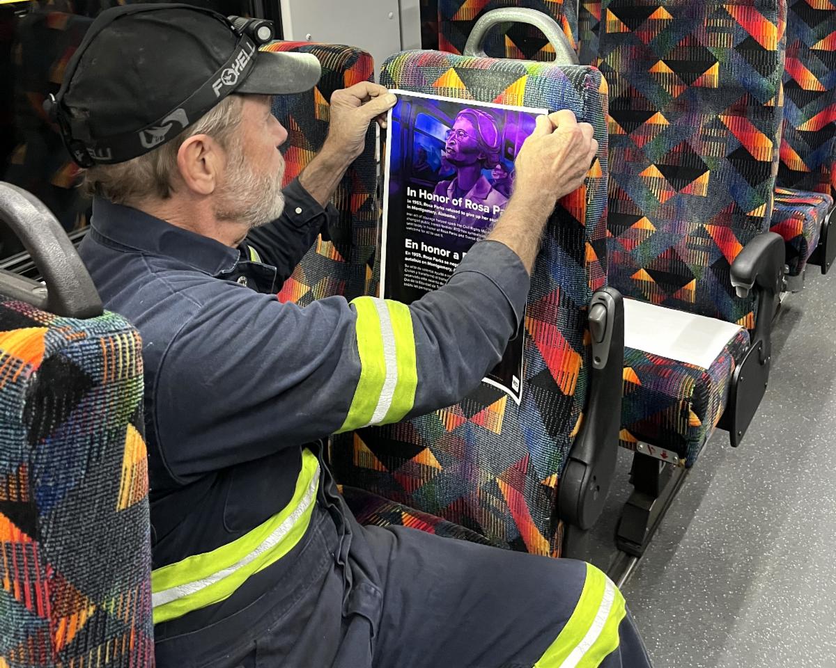 | | 'In Honor of Rosa' signage installed for Transit Equity Day | | To prepare for RTD’s recognition of Transit Equity Day, colleagues at Boulder, East Metro, and Platte divisions installed commemorative signage yesterday on one select seat aboard each fixed-route bus to honor Rosa Parks and her courageous act of resistance. Above, body mechanic Melvin McCormick sets a sign on a bus in Boulder. These temporary "In Honor of Rosa Parks” signs will be in place during the full service day today, and they are intended to be symbolic and informational. Colleagues who are on social media are welcome to snap a photo of these seats – with or without you in them – and tag @rideRTD. | | Welcome to RTD's newest employees | | Twenty-two employees joined the agency at Monday’s orientation. Welcome! | | February’s Operator of the Month is William Gonglach from East Metro Division! Gonglach was chosen for his hard work to reunite a customer with their laptop after it was left on his bus. He found the item and kept it safe with him until he was able to meet the customer back at Union Station to return it. | | |
