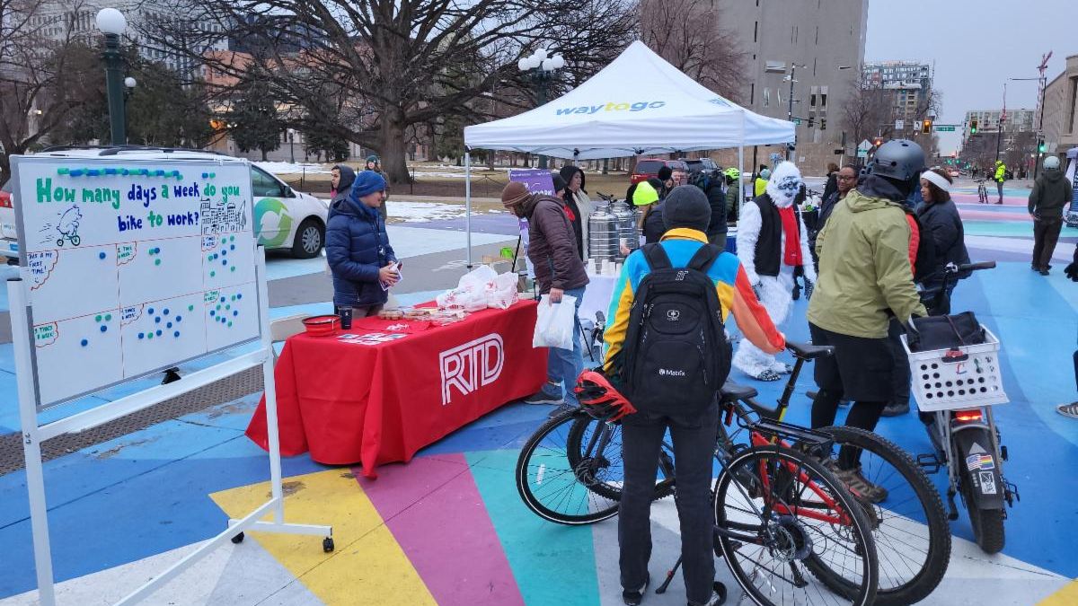 On Feb. 13, commuters from across the region are encouraged to bike to their workplaces to promote a healthier community and planet. From 7 to 9 a.m., RTD will be set up at the Market Station Base Camp behind the agency's headquarters at Blake Street, handing out hot cocoa, coffee, and other giveaways.