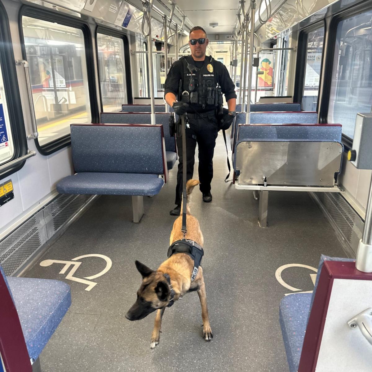 In the second photo, Officer Keith Cambra conducts a routine search of a light rail train with K-9 Koa, “ensuring all of our customers have a safe and welcoming environment for wherever their travels take them,” Cousineau said.