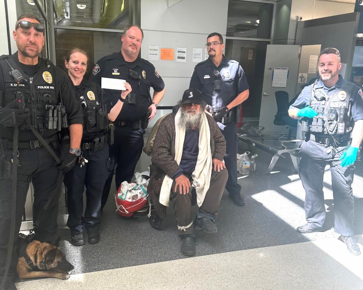 In the first photo, Officer Keith Cambra, Cpl. Misa Peterson, Officer Scott Butler, Officer Brian Cambra and Officer Ian Galgano are pictured with a man who was stuck at Denver Union Station last week because he lost his ticket to Albuquerque, N.M., and did not have the resources to purchase another one. The man was also hearing-impaired and non-verbal, which challenged his ability to communicate with others and caused him some frustration. These officers and Sgt. Jason Spillis (who took the photo), Cousineau said, “were patient with the gentleman, understood his difficult situation and took it upon themselves to help him. The officers collected money out of their own pockets and purchased a ticket for the gentleman and assisted him so he could make it home.”