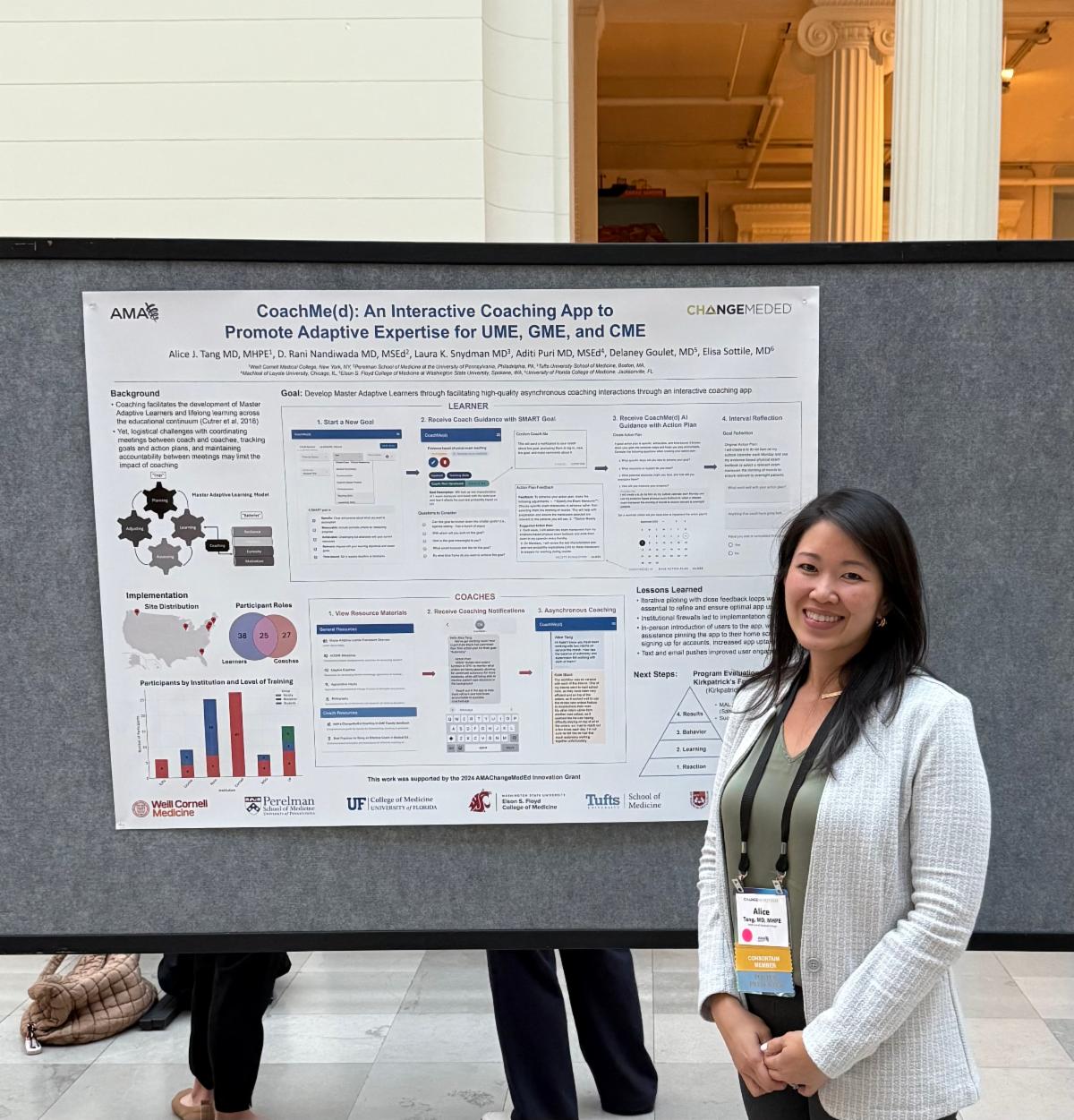 Dr. Alice Tang presented a poster on CoachMe(d) at the AMA ChangeMed Conference in Chicago. Developed through a multi-institutional innovation grant, this AI-powered coaching app supports Master Adaptive Learners across the educational continuum. It teaches how to create SMART goals and action plans, while enabling asynchronous coaching to foster accountability and real-time support between sessions.