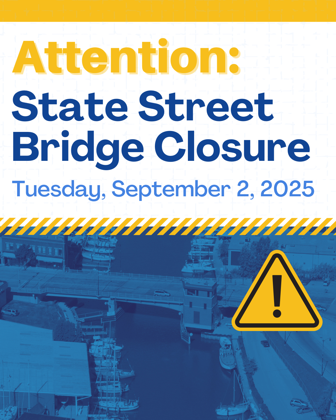 The City of Racine is advising residents and travelers that the State Street Lift Bridge will be closed on Tuesday, September 2, 2025, from 8:00 a.m. to 3:00 p.m., to accommodate scheduled structural testing.