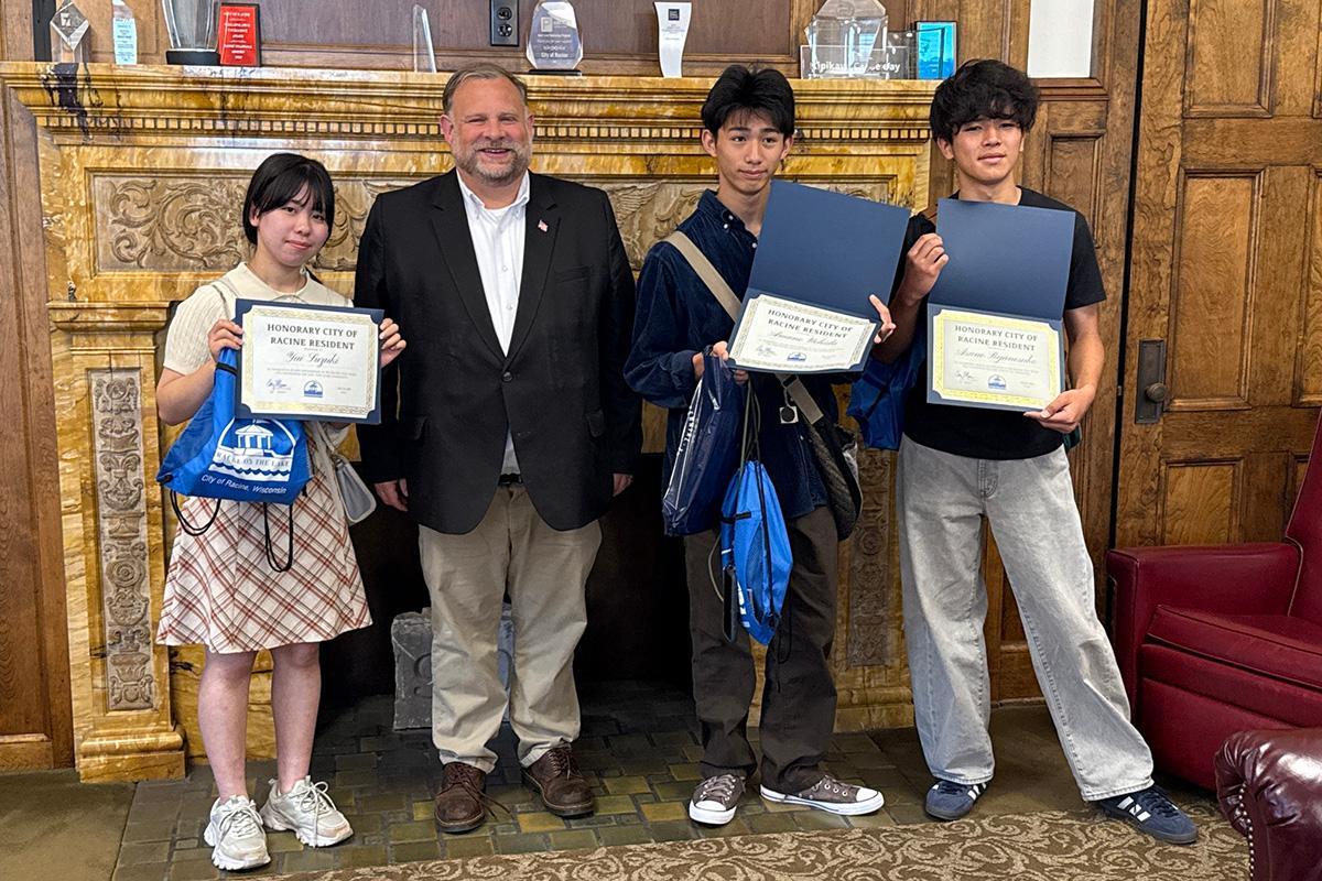 Last Wednesday, Mayor Mason welcomed three students visiting Racine from our Sister City of Oiso, Japan! During their visit to City Hall, each student received a certificate declaring them an Honorary Resident of Racine, a symbol of the friendship between our two communities.