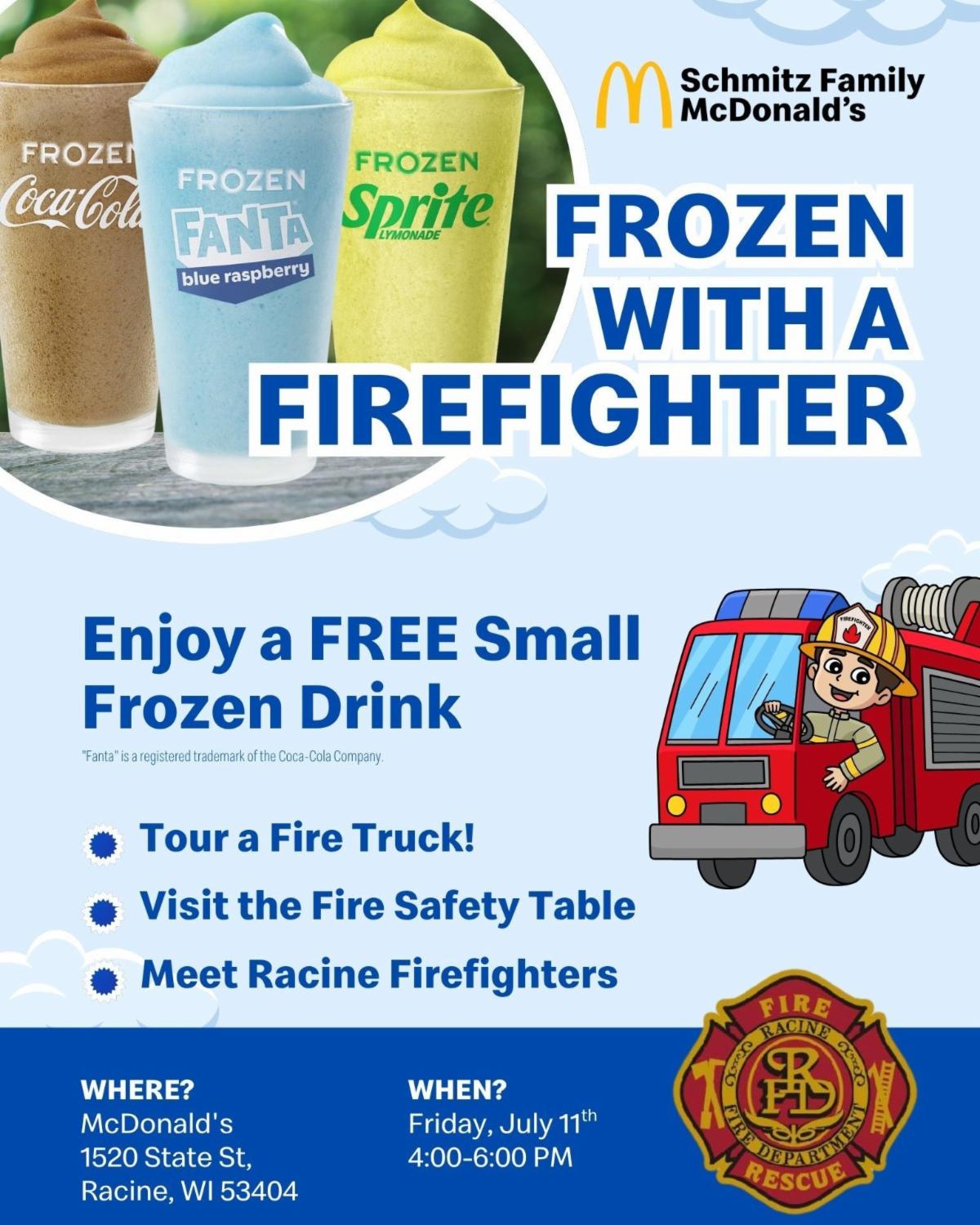 Beat the summer heat with the Racine Fire Department at a special community event this Friday, July 11, from 4 to 6 p.m. at McDonald’s, 1520 State Street. Families are invited to stop by for a FREE small frozen drink, explore a real fire truck, and meet the dedicated firefighters who help keep our community safe.