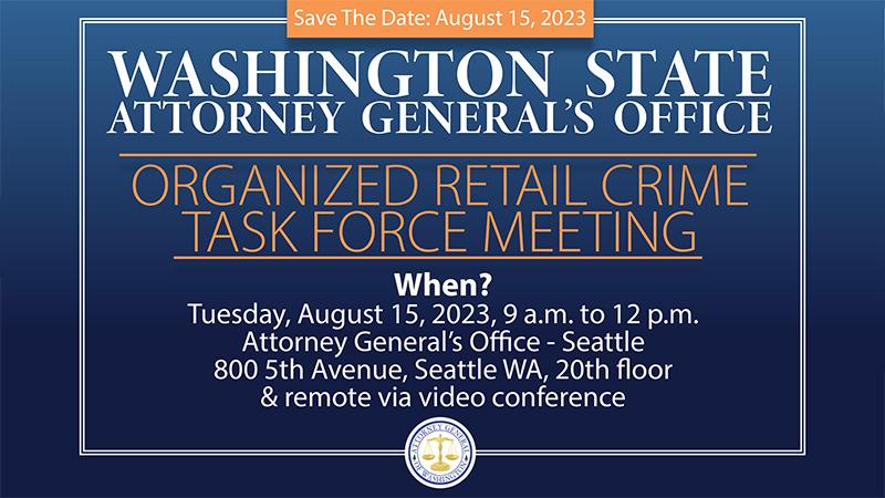 The Office of the Attorney General is holding its fourth Organized Retail Crime Task Force meeting on August 15, 2023, between 9:00 a.m. and 12:00 p.m.