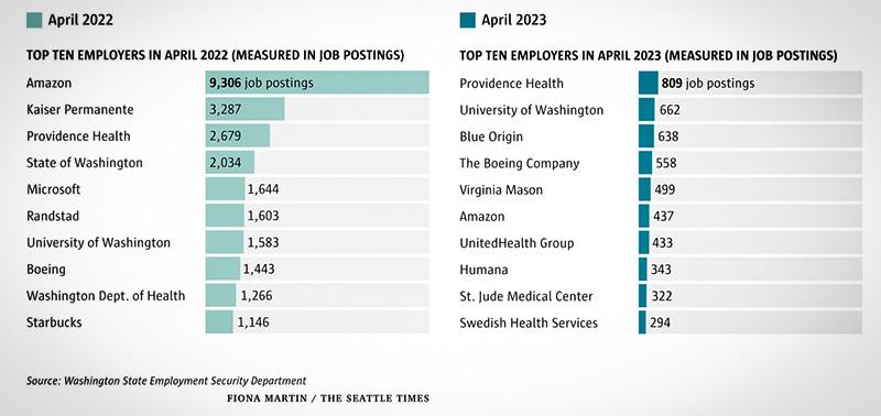 Washington’s job market has shifted significantly, with the healthcare sector surpassing the tech industry as the hottest job market. In April, six of the top 10 employers in the state were healthcare companies, while tech giants faced a decline. Registered nurse job openings dominated the market, reflecting the high demand for healthcare professionals.