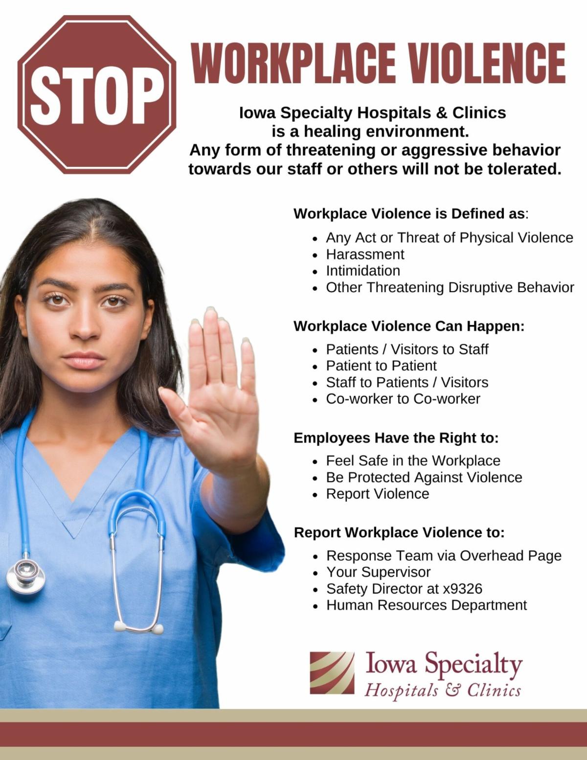 With this in mind, we wanted to take time this month to remind all staff that Iowa Specialty Hospitals & Clinics has a zero-tolerance policy for workplace violence. The safety and security of all staff are of the utmost importance, and that is why we continue to work on mitigation and prevention strategies. This month you will see the rollout of the “Stop Workplace Violence” poster campaign. The first poster will be in staff areas to bring awareness to our zero tolerance for workplace violence and empower staff to understand what workplace violence is and what to do about it. While this is a small step, when added to the other tools we have in place, such as the Response Team, AVADE training and RL6 reporting, we create a culture of safety.