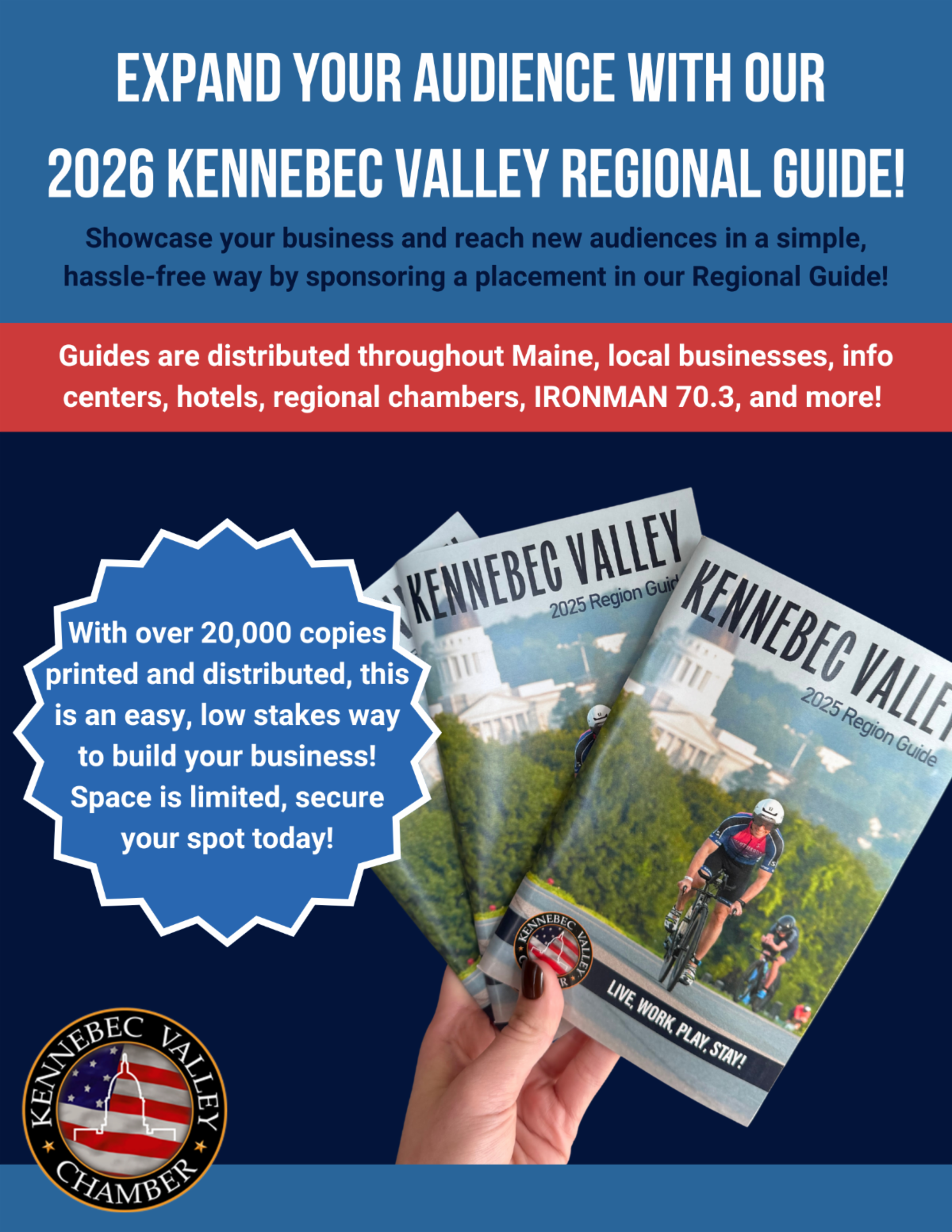 | | | To secure your spot in the 2026 Visitor Guide, or if you have any questions, please contact Melissa Walden at (207) 623-4559 or MLW@kennebecvalleychamber.com | | |