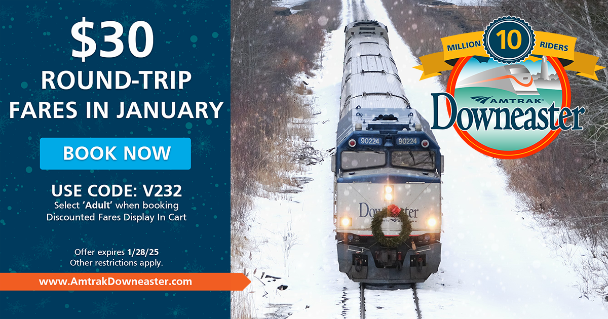 The team at NNEPRA are excited to announce that we are just a handful of weeks away from seeing our 10 millionth rider board the Amtrak Downeaster. To celebrate we are offering $30 roundtrip fares in January 2025! This is the Amtrak Downeaster’s BEST deal of the year. No blackout dates. Don’t pay more than $15 each way when you book today. Must use promo code V232 and book at least 3 days in advance of travel to receive this discount.