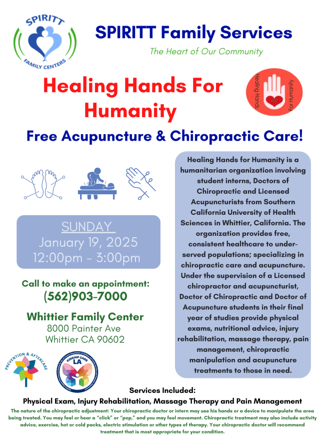 In collaboration with SCU of Health Sciences, SPIRITT is hosting free acupuncture & chiropractic care services at our Whittier Family Center.