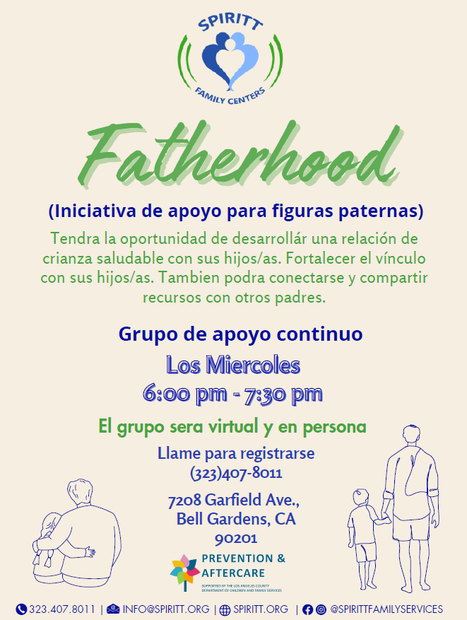 Llamando a todos los papas! Unase al grupo de apoyo a la paternidad de SPIRITT y cultive relaciones de crianza saludables, fortalezca los vinculos con sus hijos y participe en el intercambio de recursos con otros padres. Los grupos de apoyo se llevan a cabo a traves de zoom, en nuestro Centro Familiar de South El Monte y en el Centro de Bell Gardens.