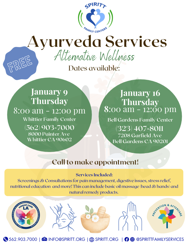 SPIRITT is hosting Ayurveda at our Whittier Family Center (English) and our Bell Gardens Family Center (Spanish). Ayurveda is based on the idea that disease is due to an imbalance or stress in a person's consciousness, it encourages certain lifestyle interventions and natural therapies to regain a balance between the body, mind, spirit, and the environment.
