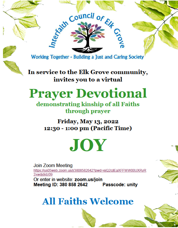 So, instead, we will present a panel of interfaith women who will answer some questions and chat about their faith traditions. Our adept moderator will be Rev Dave Lyman, who has lots of experience with this sort of thing. Our guest panelists will be: Durriya Syed – a Muslim practicing the Islamic faith; Karen Fujikawa – a practicing Hindu, Kedi Davidson – from the Baha’i faith and myself to represent Christianity (Presbyterian, Catholic and Unity – I’ve practiced them all!). The program will be hybrid; with in-person attendance in Spiritual Life Center’s sanctuary and it will also be live-streamed so you can watch from home. My hope is that you will hear the beautiful similarities between faith rituals and faith values. When we see that others are on the same wavelength as we are, it is easier to connect with them, realize we are all ONE, and call them our brothers and sisters. I hope you will join us that night however you can.