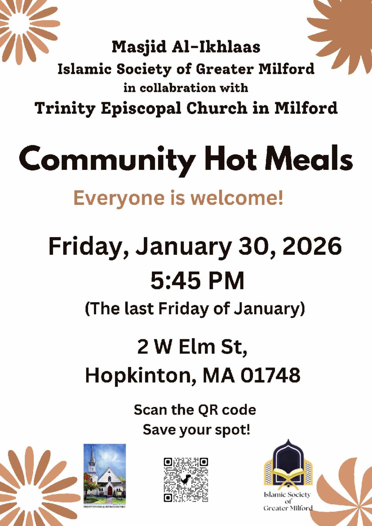 The Islamic Society of Greater Milford, our dialogue partner, along with Trinity Episcopal Church of Milford are providing community meals on Friday, January 30, 5:45 pm, 2 W. Elm Street, Hopkinton. If you would like to volunteer or join in the meals