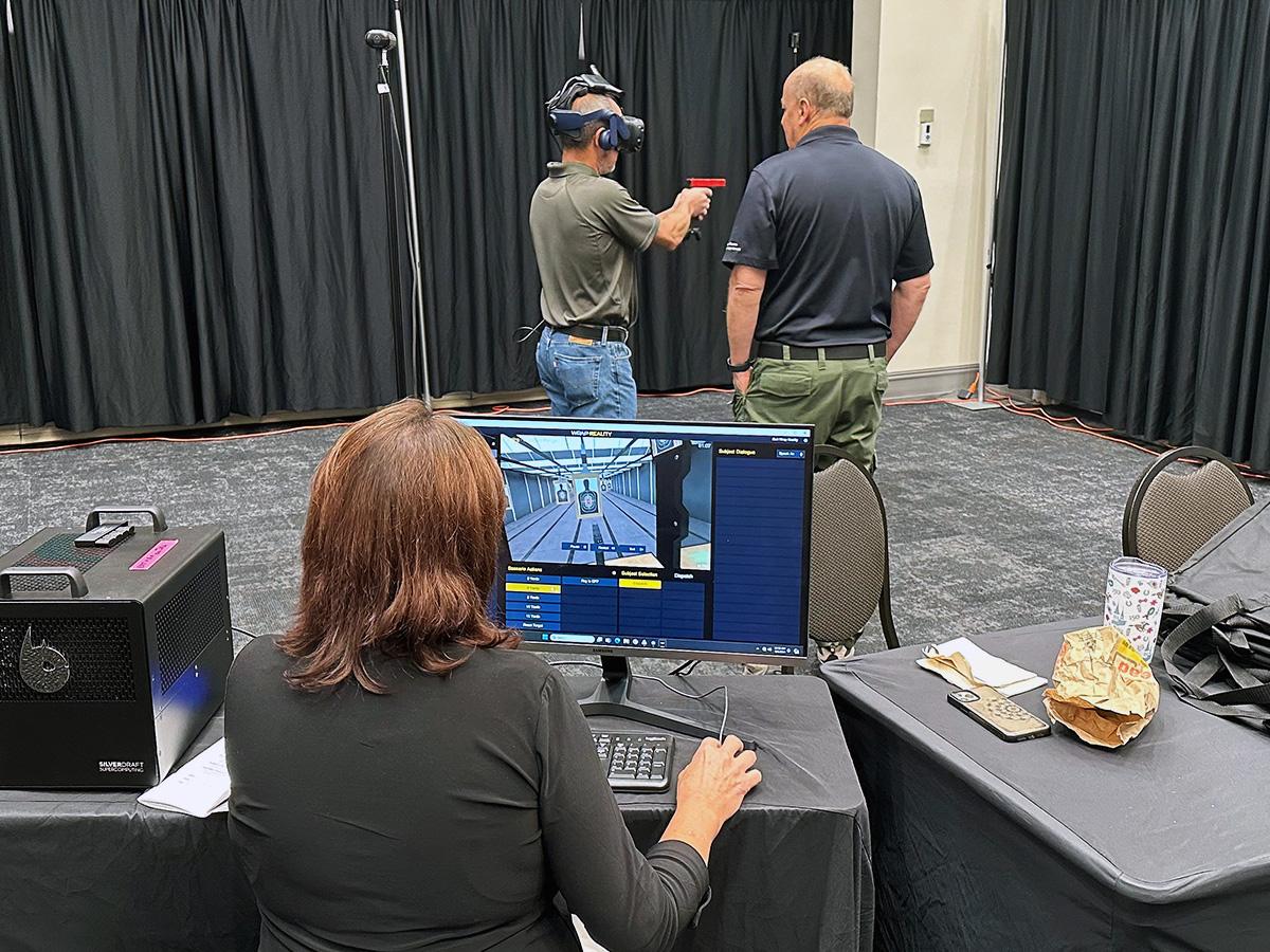 Meade County Jailer J.J. Scarborough uses the WRAP VR training system during the jailers conference with help from KACo’s Phil Crumpton. | |