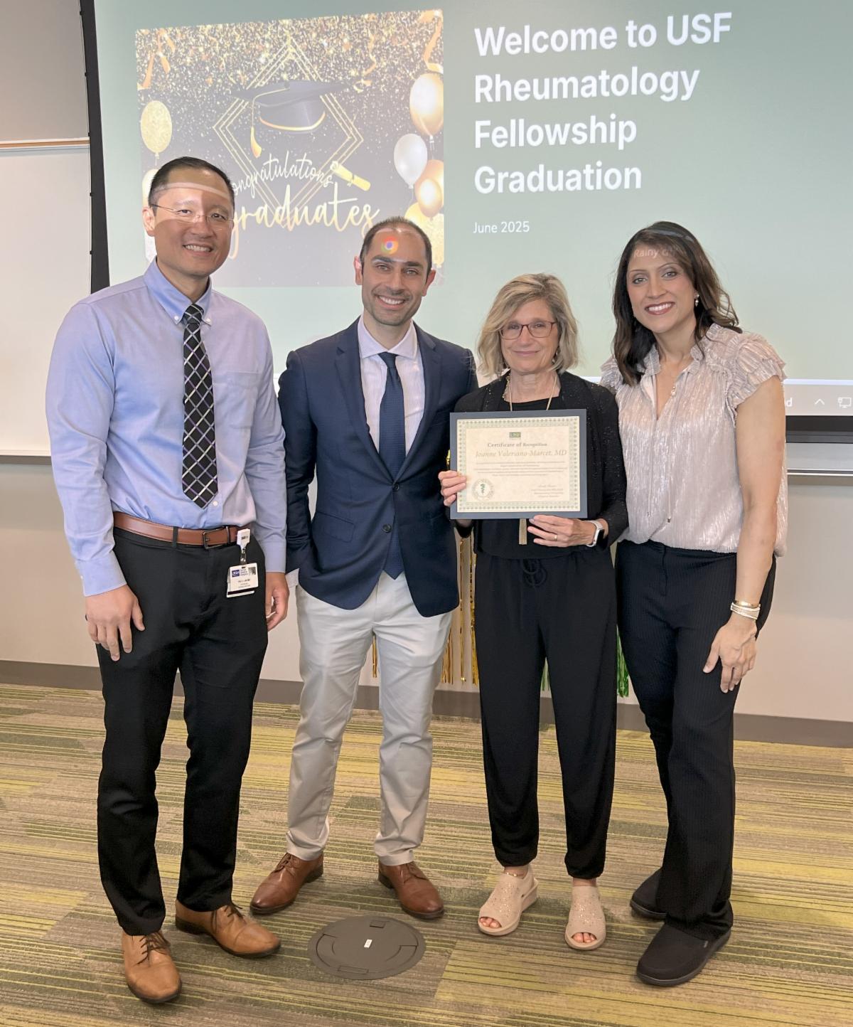 Joanne Valeriano-Marcet, MD was presented with a Certificate of Recognition for her exemplary leadership, unwavering dedication, and lasting contributions as the Program Director of the USF Rheumatology. Her commitment to excellence, passion, and mentorship has left a significant impact on the program and has set a standard of excellence and profoundly influenced future generations of rheumatologists. (Pictured with Drs. Lin, Succari and Brar)