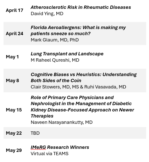 | | Thursdays, 12:00 to 1:00 PM | | Spotlight on Pulmonary, Critical Care, and Sleep Medicine | | Stephen Liggett, MD and Jose Herazo-Maya, MD team | | |