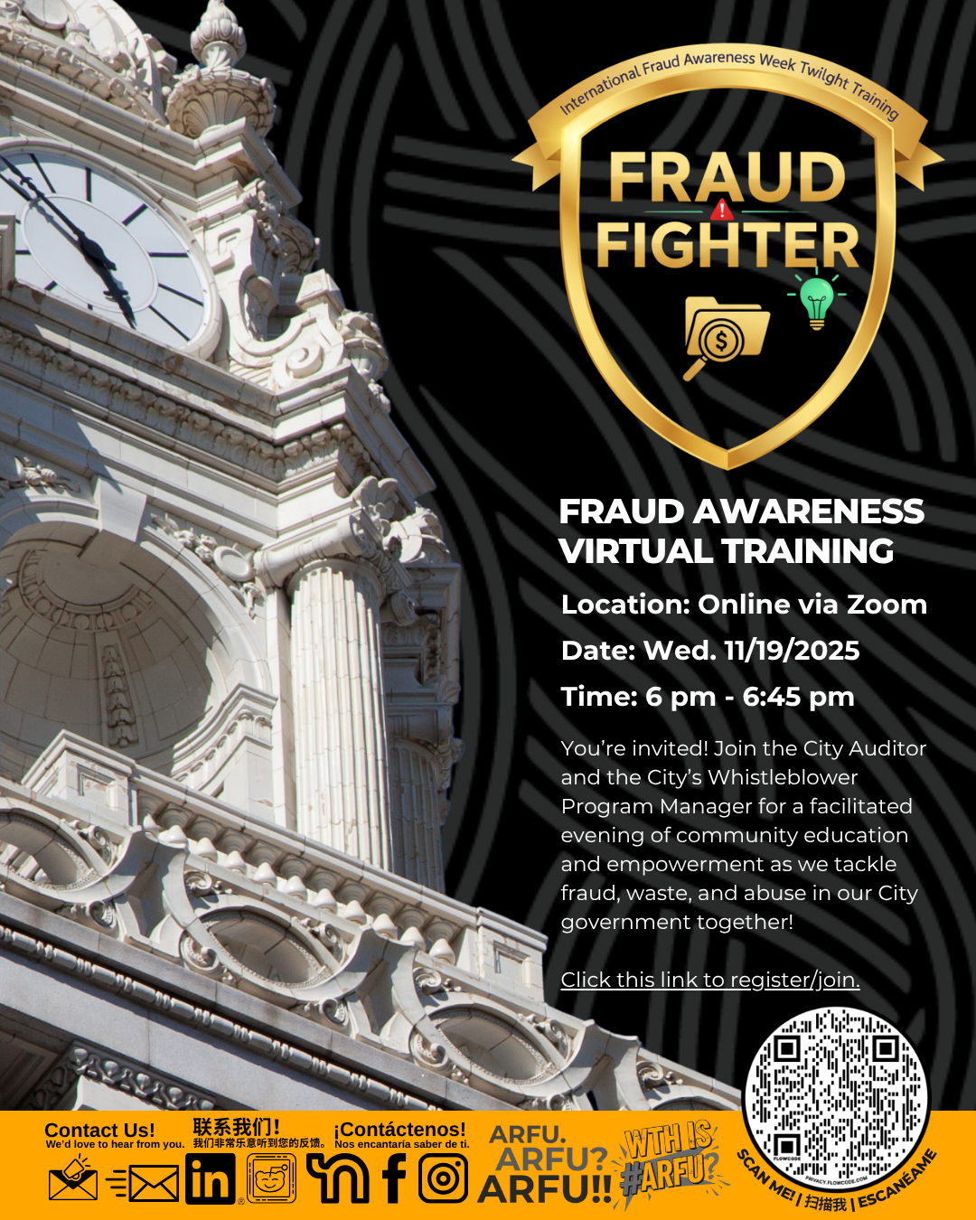 Join us on Wednesday, November 19th, from 6:00 p.m. to 6:45 p.m. on Zoom to learn what constitutes fraud, waste, and abuse, and how combating these issues contributes to maintaining the integrity of our City. This training is a unique opportunity to learn and grow in your role as a fraud fighter.