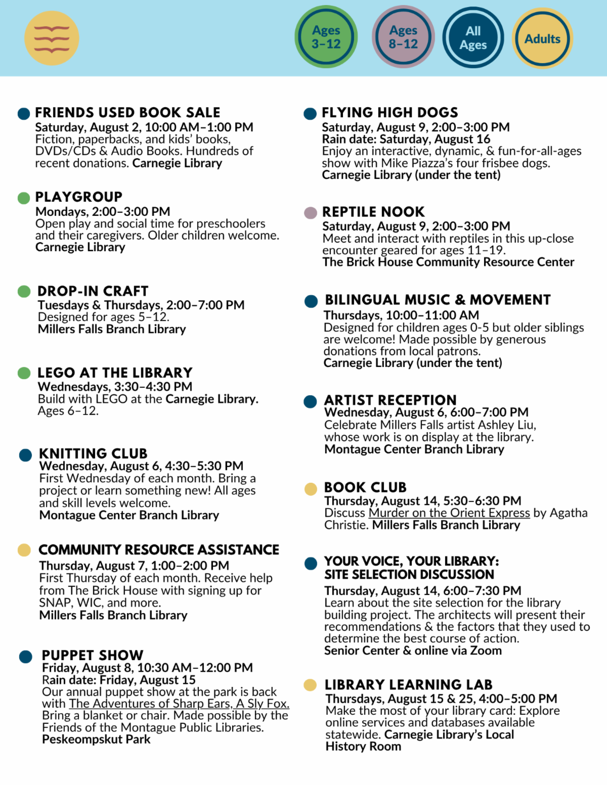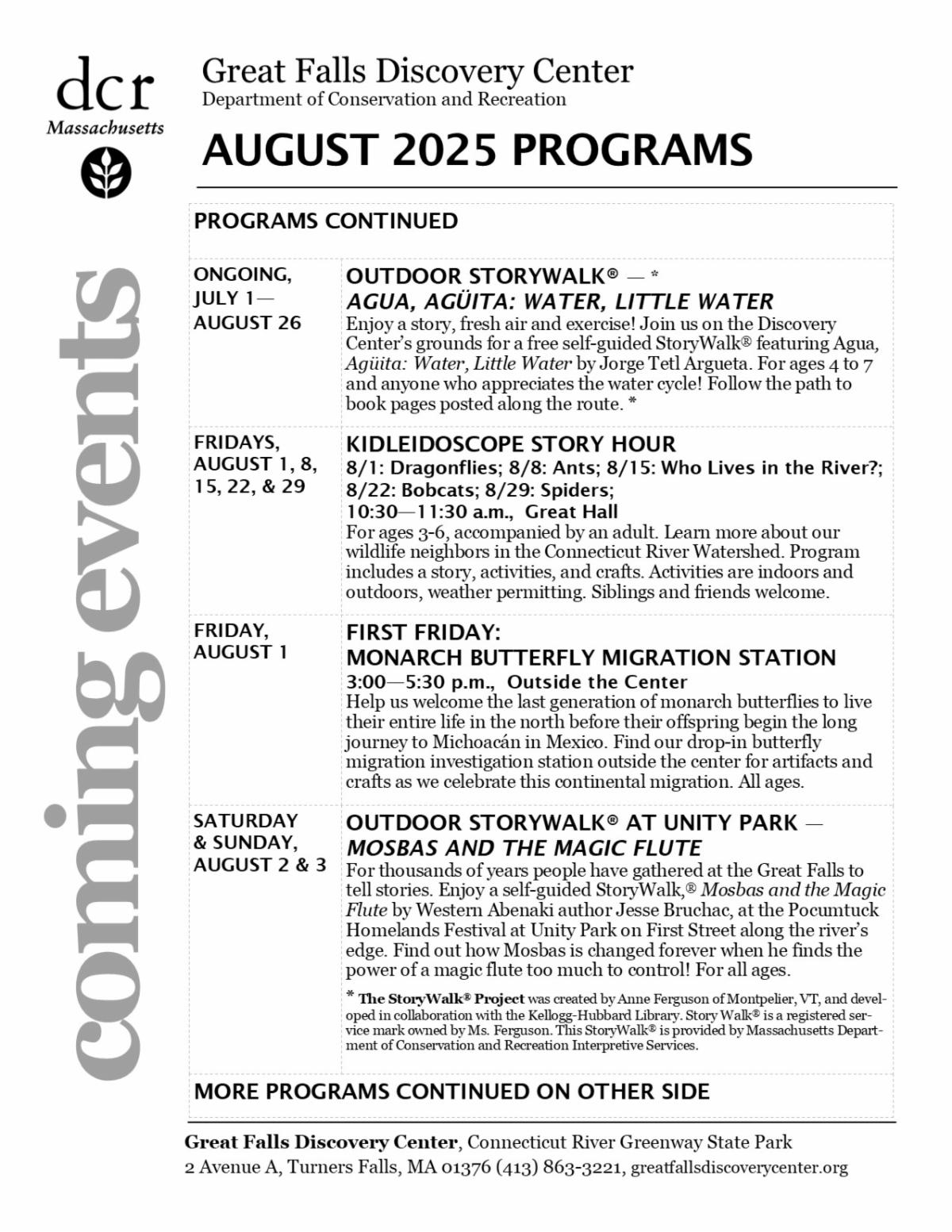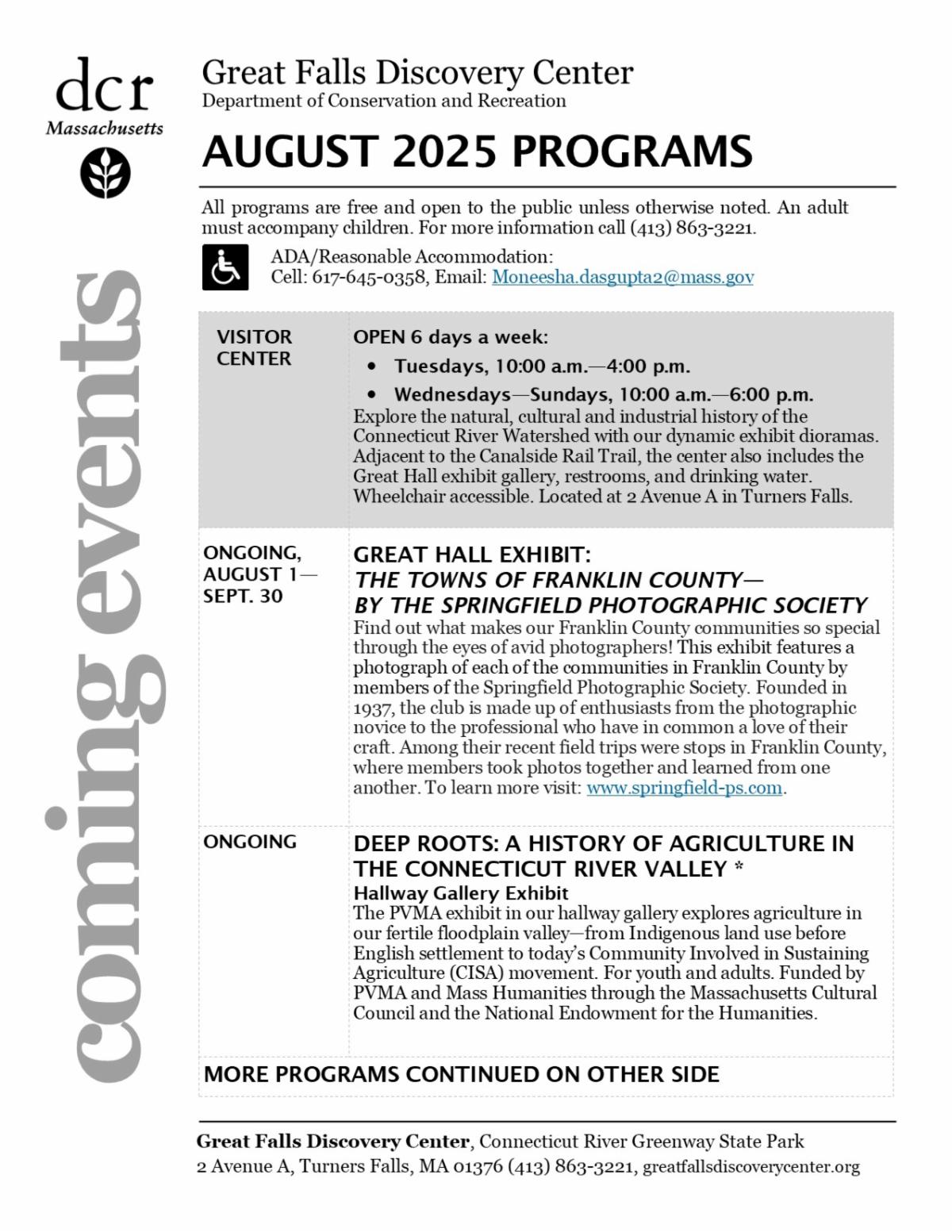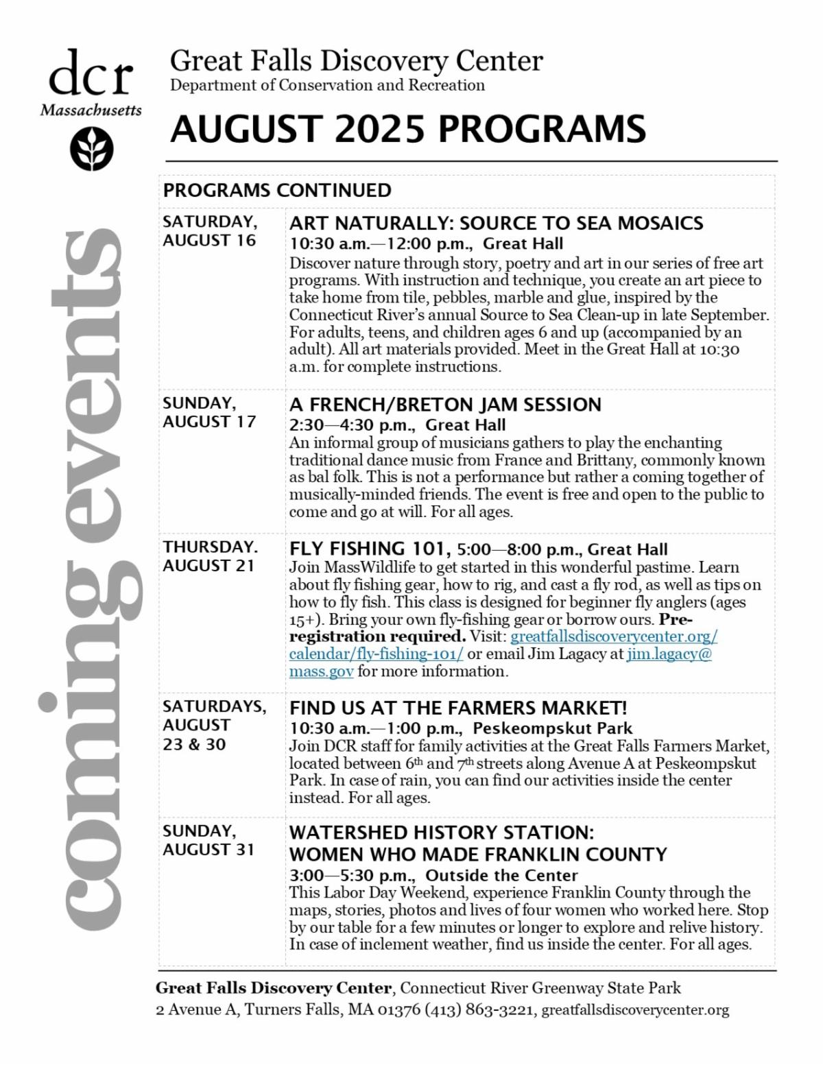 | | | FEATURED EVENTS AND ANNOUNCEMENTS | | NQRC Second Annual Photo Collage Project | | Click here for Post-Opioid Overdose Outreach Services | | Time Sensitive Announcements | | August 22 4th Friday Fiesta Mariachi Band & Pinatas | | August 22 Carol Devine & The Mighty Fine | | August 22 Summer Concert Series: Matt York | | August 23 Charlemont Reggae Festival | | August 23 Stone Soup Cafe's 20th Annual Harvest Supper | | August 24 Erving Public Library Book Club | | August 26 Nurturing Fathers | | August 26 Music on the Patio: Juggler Meadow String Band | | August 28 Bilingual Music & Movement | | August 29 Cinemastorm Martial Arts Extravaganza | | August 30 WHWHE: Fables for a New World | | August 30 Overdose Awareness Vigil | | September 4 Housing Search Presentation | |