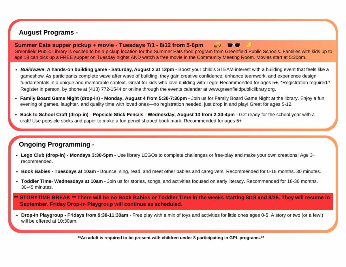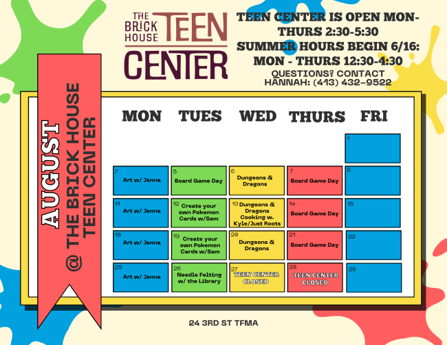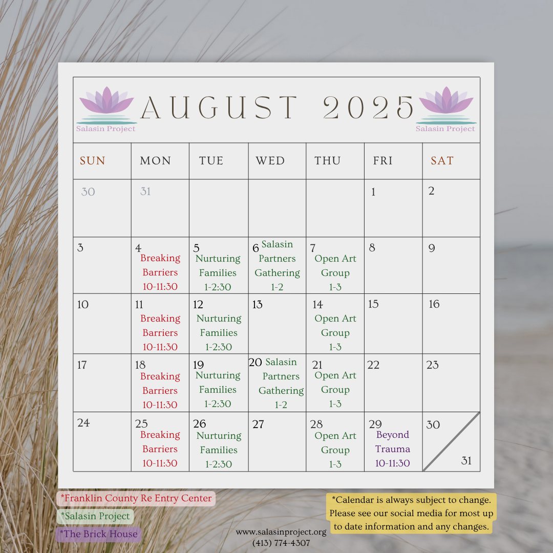 | | Wednesdays Virtual All Recovery Meeting | | Wednesdays BIPOC ALT2SU (Alternatives to Suicide) | | Wednesdays - Wendell Library Playgroup with Sylvia | | Wednesdays - Playgroup at the Leverett Library with Gillian | | Wednesdays HEROES Study Hub at GCC | | Wednesdays Health Connector & Mass Health Navigator Drop In Hours | | Wednesdays Face The Storm Men's Group | | Every Other Wednesday Salasin Project Housing Support | | First Wednesday Gentle Yoga and Breathwork with Jennifer | | First Wednesday - Money Wise Financial Education Sessions | | Third Wednesday - Fatherhood Meetup | | Last Wednesday - Office Hours With An Attorney | | Wednesdays and 2nd Saturdays The Nest Community Closet | | First Thursdays Through November Ukulele Monthly Class | | First & Third Thursdays Parent Support Group | | First & Third Thursdays Eagles Meeting | | Thursdays Music Tween Group | | Thursdays Coffee Hour at the Brick House | | Thursdays Beyond Trauma Group in Spanish | | Thursdays Windows and Mirrors Playgroup | | Second Thursdays -Peer Grief Support After Overdose Death | | Second & Fourth Thursdays Community Meeting | | Third Thursdays Court Service Center Walk-in Days at the North Quabbin Patch | |