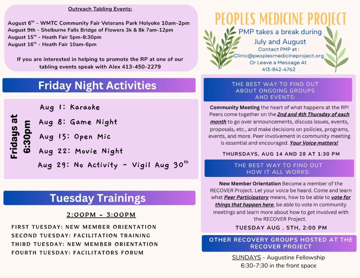 | | Friday Peer-led Meditation Group | | Fridays FreeWrite of Franklin County | | Friday All Recovery Meeting and Drop In Recovery Coach Support | | RECOVER Project Friday Nights | |