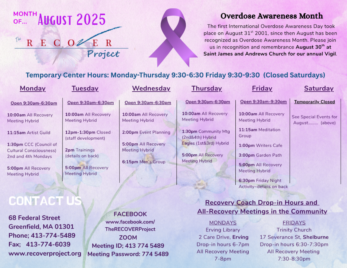 Greenfield: Overdose Awareness Vigil, Saturday, August 30, 2025, 6:30 PM in the Courtyard Labyrinth, Episcopal Church of Saint James and Andrew, 8 Church Street, Greenfield, MA. Organized by The RECOVER Project.