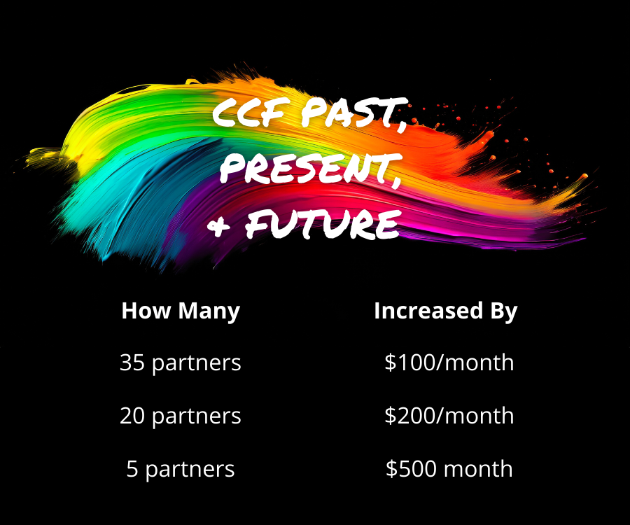 2) by finding at least 60 partners who will increase (even from zero!) their monthly contribution to the CCF general fund by $100, $200, $500, or more.